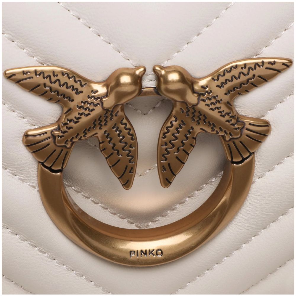 Elevate your style quotient with the PINKO matelassé shoulder bag – a true emblem of sophistication. Crafted from luxurious calfskin, this white stunner boasts an intricate bird detail that adds a touch of unique glamour. With a flap closure secured by magnetic buttons and a versatile leather and metal strap that’s both adjustable and removable, it epitomizes practical elegance. Whether worn crossbody or on the shoulder, the bag ensures your essentials are neatly organized with an internal zip pocket. Measuring 26×12.5×5 cm, it’s the perfect accessory for the fashion-forward individual.